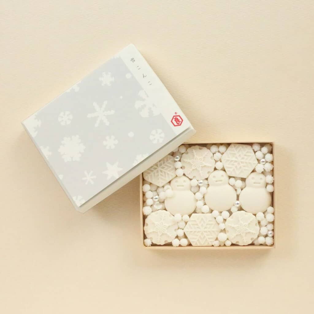 雪こんこは、雪だるまと雪の結晶をかたどった干菓子。箱に詰められたかわいらしい干菓子の周りには、ゆかり(お米のポンを軸にした金平糖のようなもの)と、アラザンが添えられています。どこか上品さもあり、メッセージカードが添えられているため、クリスマスプレゼントや、大切な人への贈り物にもぴったり。税込1512円と、比較的手に取りやすい価格なのも魅力です。