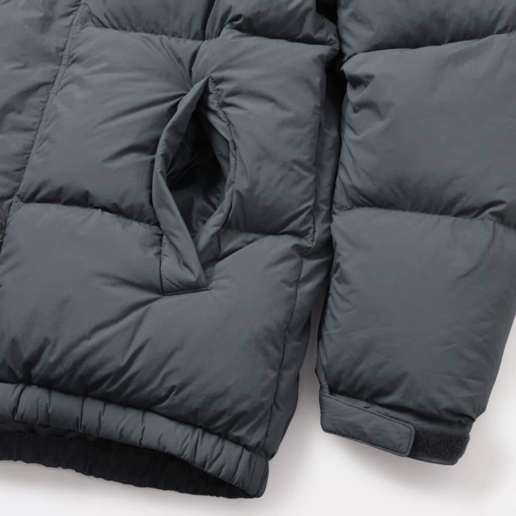 羽毛は750フィルパワーのものを採用しており、見た目はすっきりとしていながら、暖かさをしっかり確保できる点が特徴です。首元まで前立てが続く設計で冷気の入り込みを抑え、袖口は面ファスナーで調整が可能。生地は薄手、フィット感はゆったりめのため、中にニットやスウェットを重ねても動きやすく、季節の変わり目から冬場まで幅広く使えます。