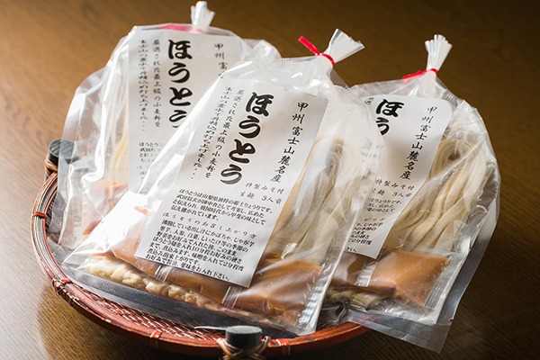 山梨県の郷土料理として知られる「ほうとう」は、平打ち麺にカボチャやイモ類、キノコや季節の野菜、肉といった食材をみそ仕立ての汁で煮込んだ郷土料理。「富士山温泉 ホテル鐘山苑」の直営店である「浅間茶屋」では、家庭でも気軽にほうとうが楽しめる「浅間ほうとう」を販売しており、太くてもちもちツルツルの麺が特徴とのことです。