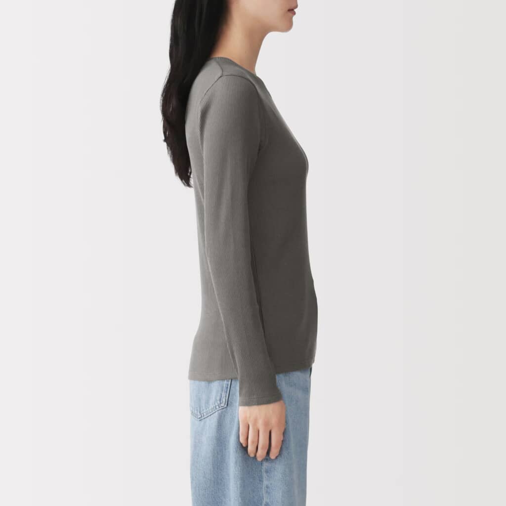 無印良品から販売されている「婦人 なめらかリブ編みクルーネック長袖Tシャツ」が、ほどよいフィット感で着心地がよく、さまざまなシーンで活躍する上、コスパもよいので色違いで複数枚買いする人が多いほど人気を集めています。