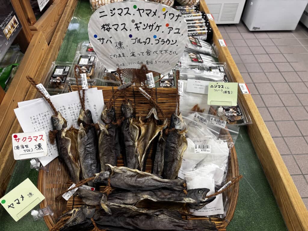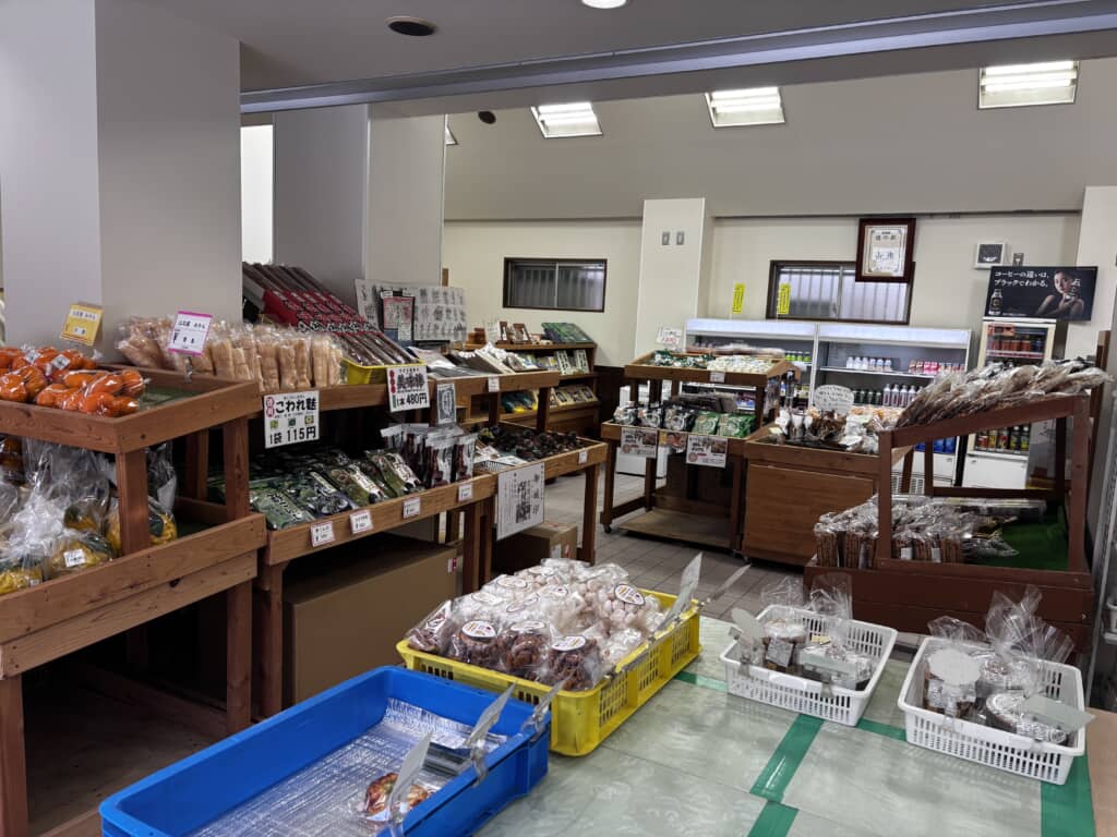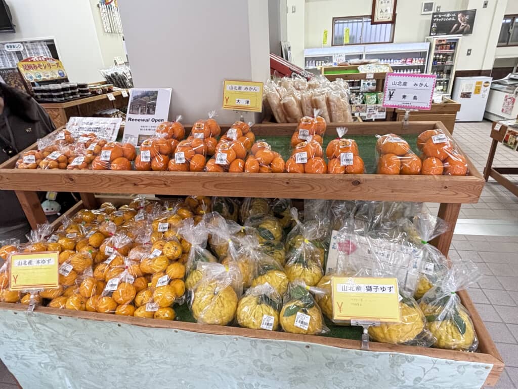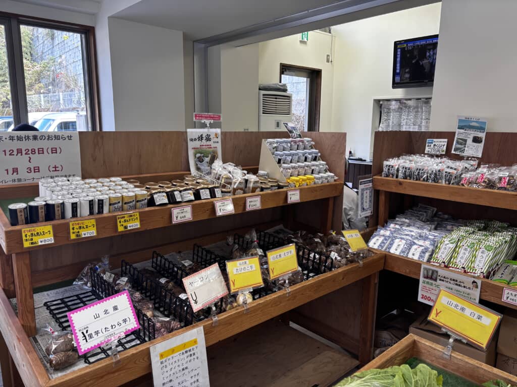 直売所には足柄山斜面で育った甘くて濃厚なみかんや、神奈川県西部が一大産地であるキウイフルーツの他に新鮮な野菜がズラッと並んでいます。他にも大きな麩菓子、足柄味噌、おしゃれなTシャツ、いぶされた川魚などコンパクトながらも見どころ満載な商品が並ぶ直売所とお食事処が揃う質の高い道の駅です。
