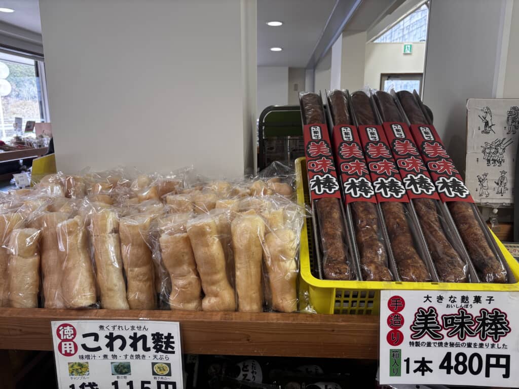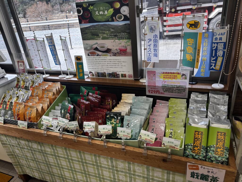 大きな麩菓子に種類豊富なお茶も売っています。
