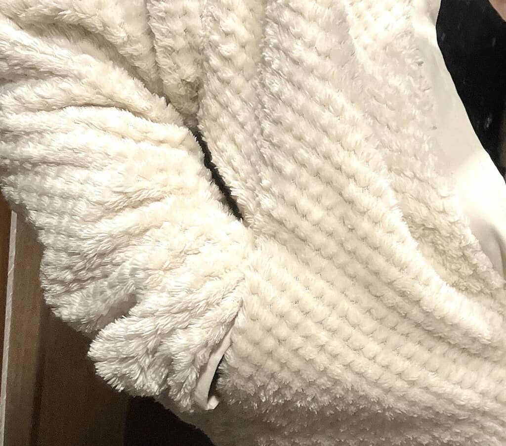 筆者は身長153センチでMサイズのアイボリーを長袖Tシャツの上から着用してみました。フリース素材ながらほんのり光沢感があり、カジュアルながら上品な印象。触れると毛足はなめらかで、例えるならうさぎを撫でているような心地よさです。