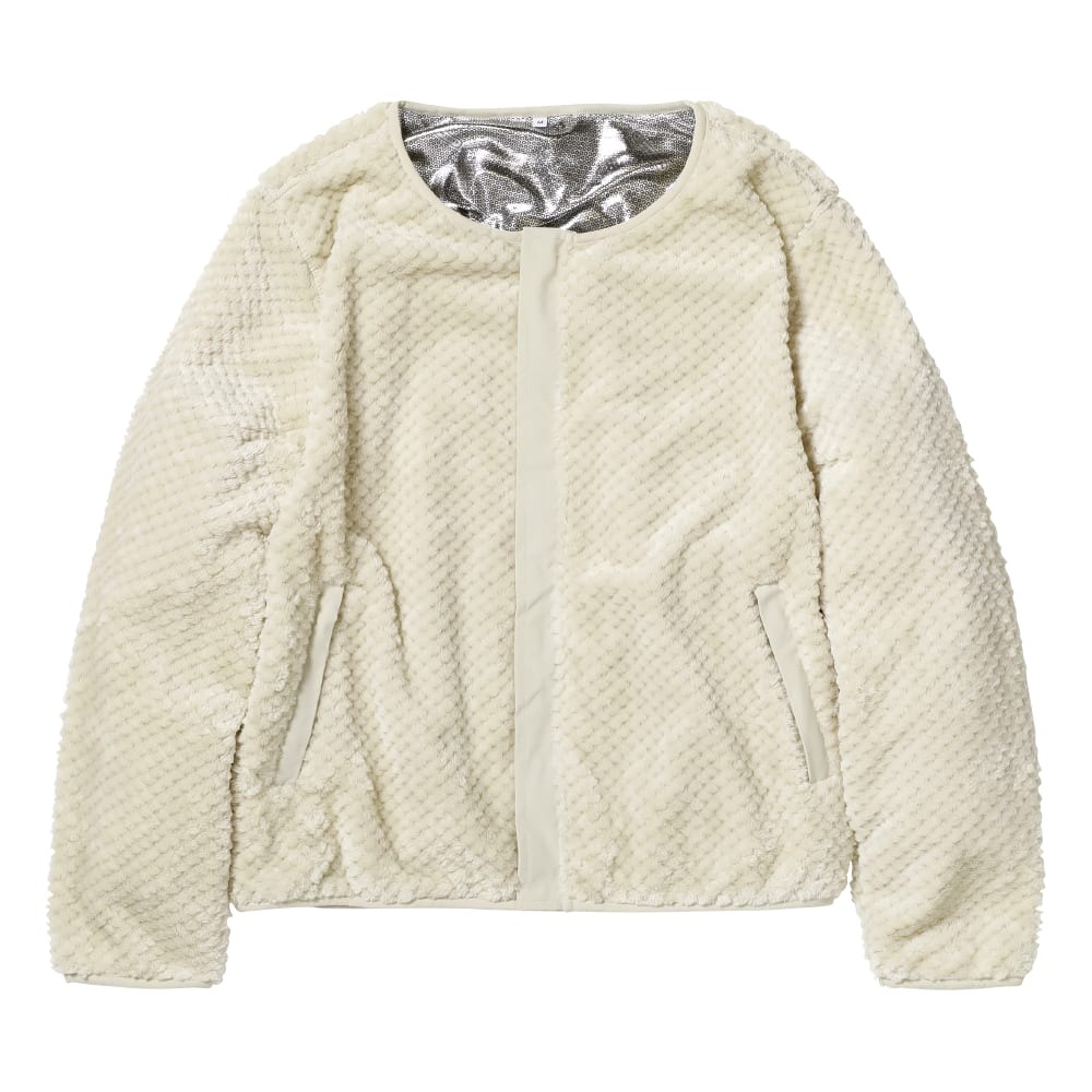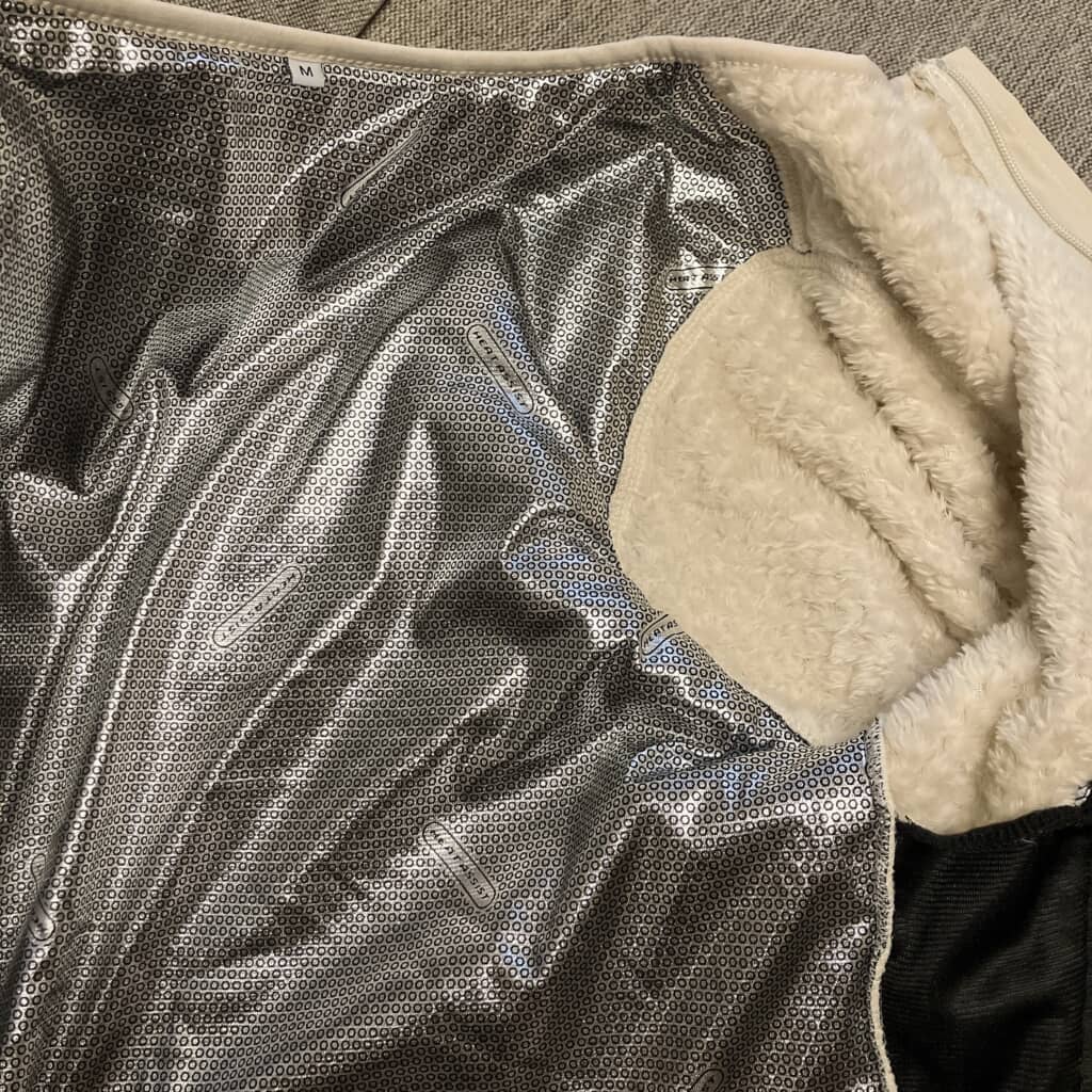内側は背中部分にアルミプリントの裏地が施されています。最初は「シャカシャカするのかな?」と想像しましたが、実際は触ると柔らかく、着心地の邪魔になりませんでした。普通のカーディガンを羽織っている感覚で、保温性だけがプラスされている印象です。