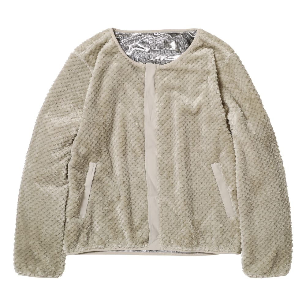 内側は背中部分にアルミプリントの裏地が施されています。最初は「シャカシャカするのかな?」と想像しましたが、実際は触ると柔らかく、着心地の邪魔になりませんでした。普通のカーディガンを羽織っている感覚で、保温性だけがプラスされている印象です。