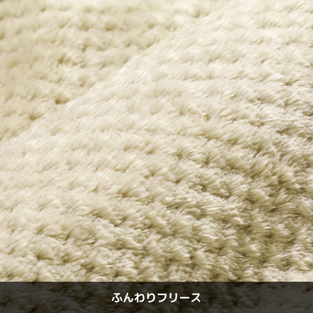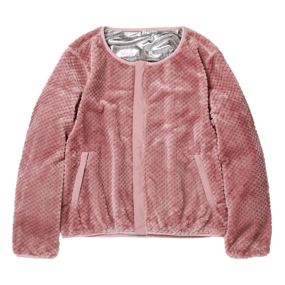 フロントは前開き仕様で、着脱しやすいのもポイント。サイドにはファスナー付きポケットを備えており、鍵などの小物を収納しやすく、外出時も安心。ダイヤ柄のフリース生地はやわらかな印象で、カジュアルになりすぎず、日常のコーディネートに取り入れやすい仕上がりです。