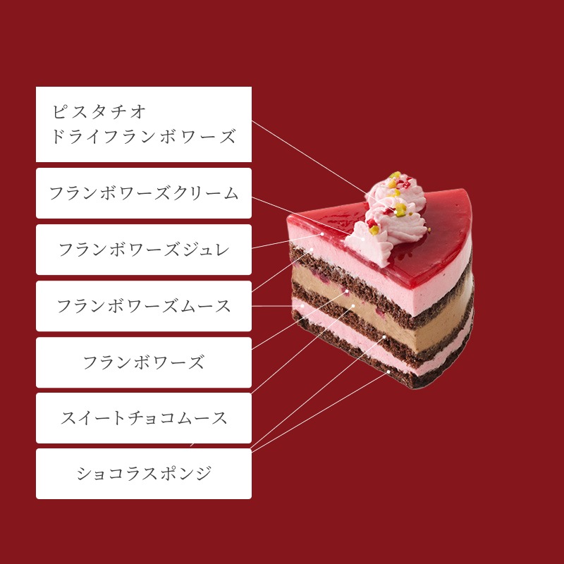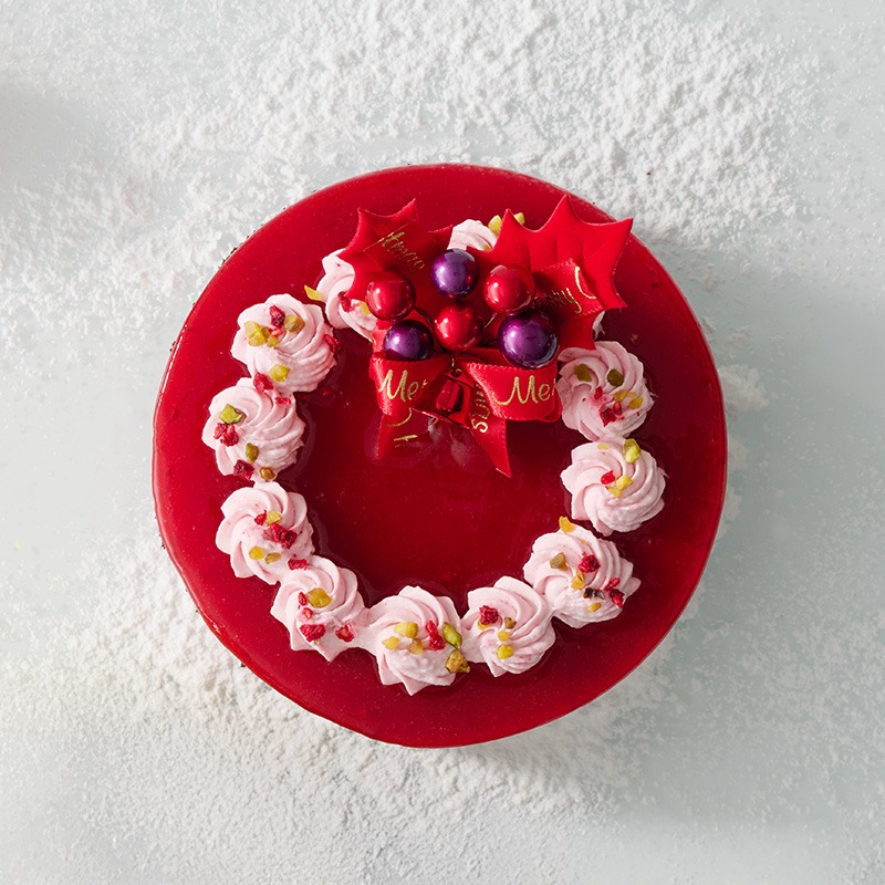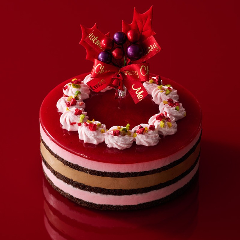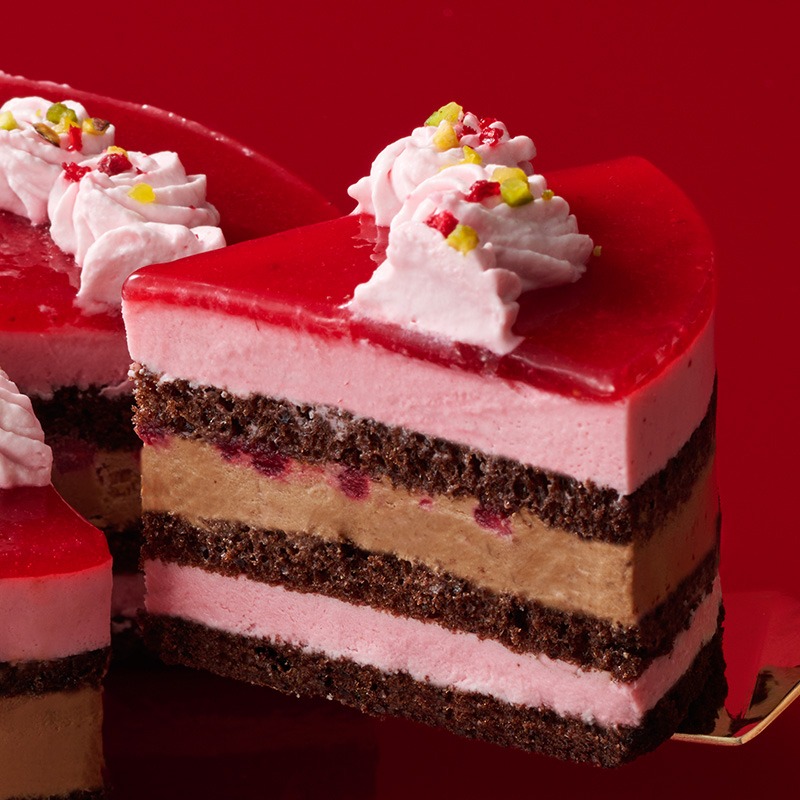 そんなルタオの「ルージュノエル」(4320円)は、ひと口で心がときめく、フランボワーズの魅力が詰まったケーキ。甘酸っぱいフランボワーズムースにベルガモットを加え、やさしい甘さのチョコムースと重ね合わせています。ムースの中に散りばめられたフランボワーズの果肉が、食感や風味のアクセントになっているのも魅力。味わいだけでなく、クリスマスの雰囲気にぴったりな華やかで上品な見た目に気分が上がること間違いなしの一品です。