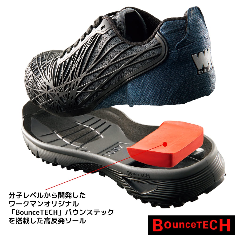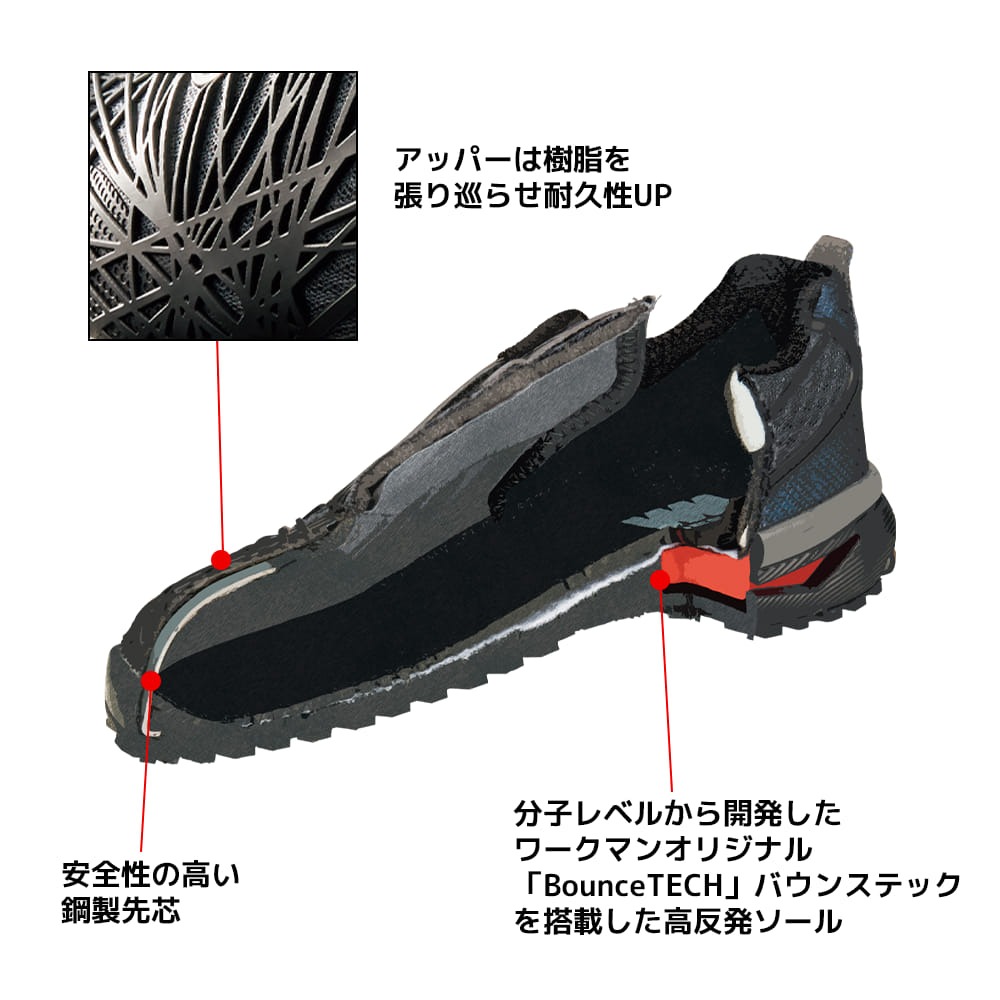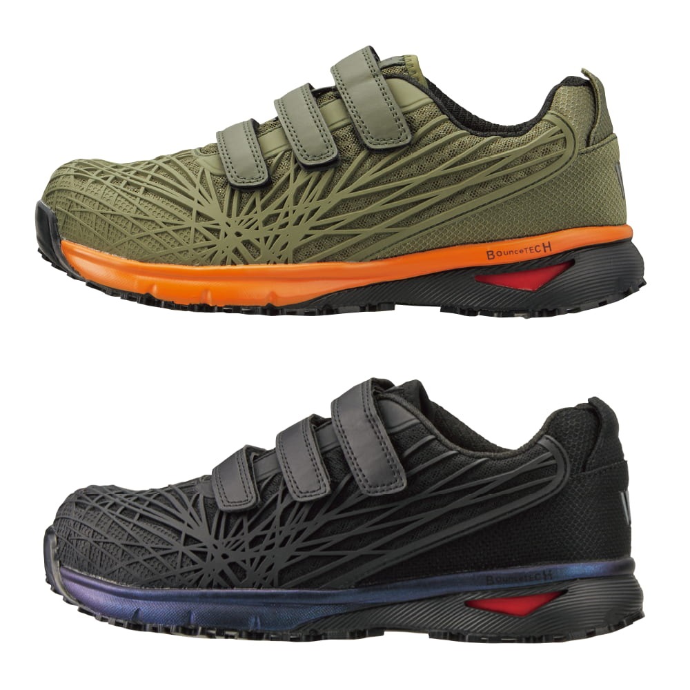 ワークマンの「ハイバウンスマジックセーフティ」(商品番号WBS530、3300円)は、3本の面ファスナーでフィット感を細かく調整できるセーフティシューズです。高反発クッション「BounceTECH(バウンステック)」を搭載した高反発ソールを採用し、アッパーは樹脂を張り巡らせて耐久性を高めています。靴底は全面ラバーで滑りにくく、耐滑底・耐油底に対応。反射材付きで視認性にも配慮されています。