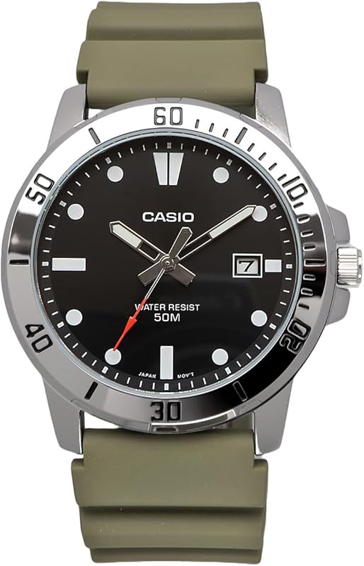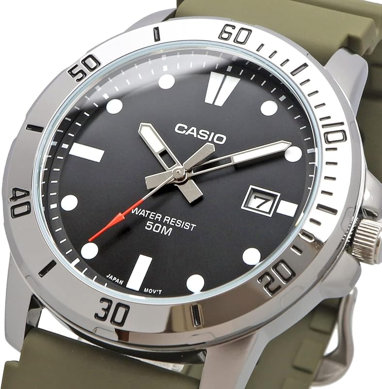 今回は同社から販売されている、視認性の高いシンプルなアナログ文字盤に、アウトドアスタイルに馴染むオリーブグリーンのカラーリングを採用した、MTP-VD01-3EVをご紹介します。