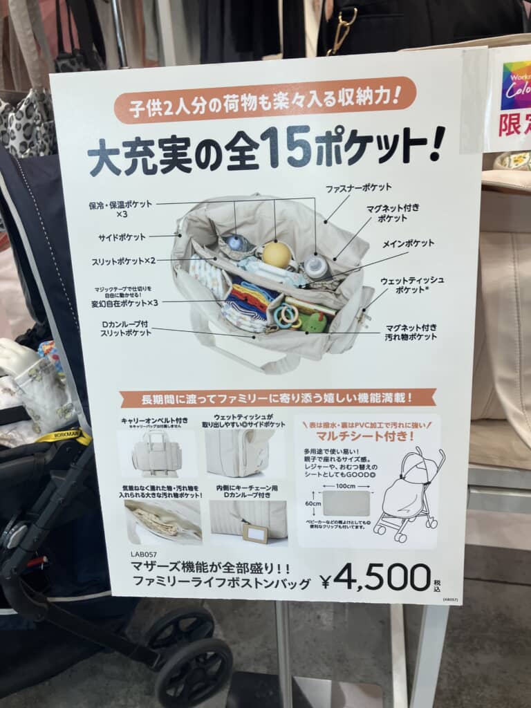 子ども2人分程度の荷物も収納できる設計で、日常使いはもちろん、旅行や帰省にも対応する頼もしさが魅力。価格は税込4500円と、ワークマンのラインアップでは高価格帯ながら、機能に注目するとむしろ安く感じるかもしれません。