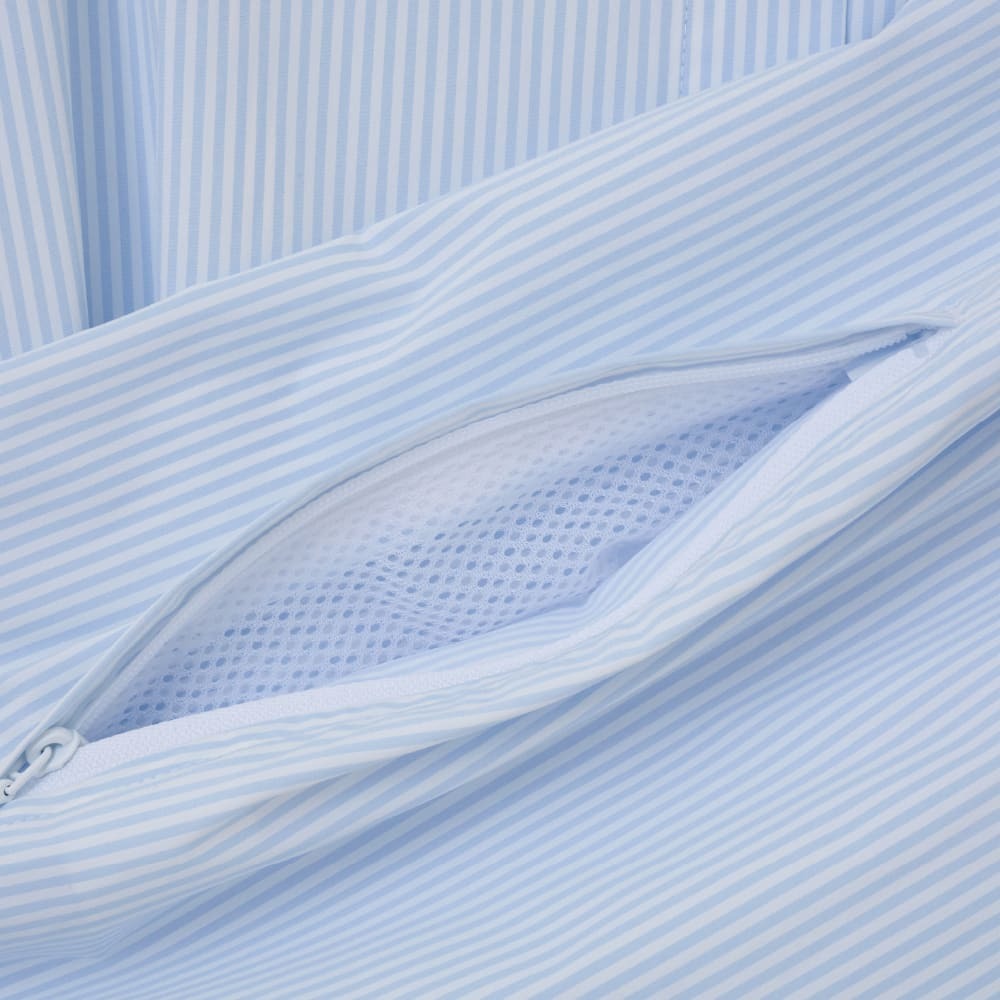 ワークマンの「レディースシーンレスチュニックシャツ」(税込1780円)は、長めの着丈で腰まわりを自然にカバーできるチュニックタイプのシャツです。素材はポリエステル100%で、吸水速乾やイージーケアに対応。汗ばむ日でも乾きやすく、洗濯後のお手入れが比較的簡単なのが特徴です。袖の内側には腕まくりをサポートする仕様を備え、サイドポケットも付いているため、ちょっとした小物を入れられる実用性も兼ね備えています。さらにパッカブル仕様で、持ち運びしやすいのもポイント。カラーはネイビーストライプ、ブルーストライプ、ライトベージュ、ピンクの4色、サイズはM・L・LL展開です。