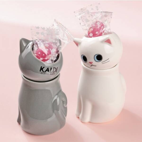 カルディから販売されている「キャットポタリー(キャンディ入り) 1個」は、グレーとホワイトの猫がかわいい陶器のアイテム。自分用にはもちろん、ちょっとしたプレゼントにもおすすめのアイテムです。