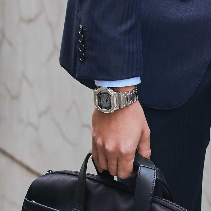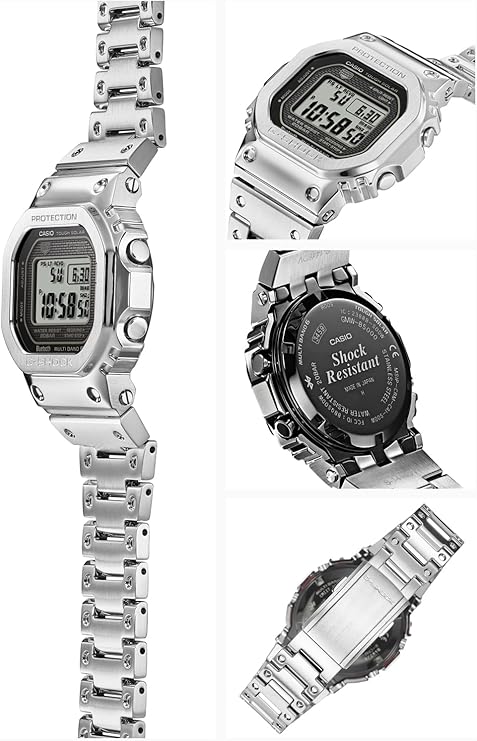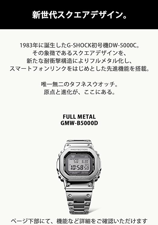 初代G-SHOCKのDNAを受け継ぐフルメタルモデルとして存在感を放つ「GMW-B5000D-1JF」。象徴的なスクエアデザインを踏襲しながら、ステンレススチール製ケースとブレスレットを採用し、現代仕様へと進化を遂げています。Bluetooth接続や標準電波受信による自動時刻補正、タフソーラーなどの先進機能を搭載し、伝統とテクノロジーを融合させた一本です。
