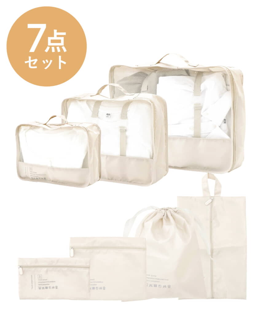 以下からは、「トラベル収納ポーチ7点セット」の詳細画像と「3COINS」のトラベルアイテム10選を紹介します!