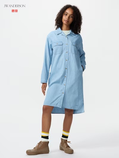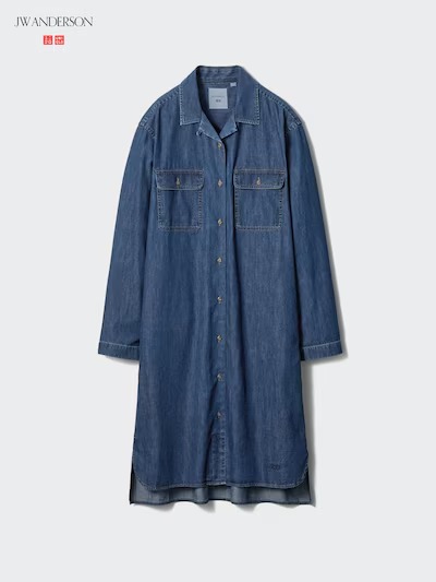 ユニクロの「オープンカラーデニムシャツワンピース」(4990円)は、シャツ感覚でさらっと着られるデニム素材のミニワンピースです。すっきり見える立体的なシルエットに仕上げているのが特徴で、ワンピースとして1枚で着るのはもちろん、パンツに合わせてチュニック風に着こなせるので、気分や気温で着方を変えられるのがうれしいところ。サイドポケット付きで実用性もあり、裾にはJW ANDERSONの刺しゅうロゴが入った「UNIQLO and JW ANDERSON」アイテムとして展開されています。サイズはSから3XLまで用意され、XL・XXL・3XLはオンラインストアのみ取り扱いとなっています。