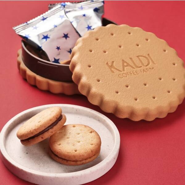 カルディコーヒーファームの「ビスケット型ケース」は、ビスケットの形をしたケースに、チョコレートクリーム入りのサンドクッキーが2個入った数量限定アイテム。思わずパケ買いしたくなる、遊び心が詰まったデザインが魅力です。価格は税込598円で、商品サイズは110×35ミリ。お菓子を食べ終わった後は、小物入れなどとして使えるのがうれしいポイントです。