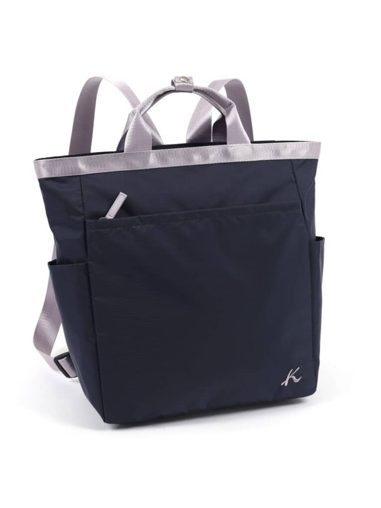 サイズはA4サイズがすっきり入るちょうどいい大きさ。容量は約17リットルで、重さはわずか430グラムと軽量です。内部には3つのポケットを備え、小物類もきちんと整理できます。外側にもファスナーポケットと2つのオープンポケットがあり、すぐに取り出したい物を入れるのに便利です。デザインのポイントは、持ち手と同色で施された「K」の刺しゅう。さりげないアクセントとして全体を引き締め、上品な遊び心をプラスしています。