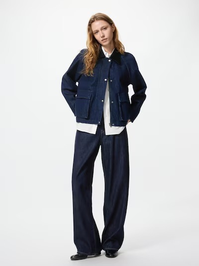 ユニクロの「ユーティリティショートジャケットデニム」(6990円)は、ウォッシュ加工を施したコットン素材を使用し、適度なハリ感でシルエットをきれいにキープしてくれるデニムジャケット。後ろ身頃にはマチ付きのプリーツを備え、ボリューム感のあるAラインシルエットを演出しています。また、コントラストカラーのコーデュロイ衿や裏地、袖口見返しのチェック柄がデザインのアクセントに。さらに上からも横からも手を入れられる二重ポケット付きで、どんなボトムスにも合わせやすいショート丈。ゆったりとしたフィット感で、リラックスして着用できるのもうれしいポイントです。