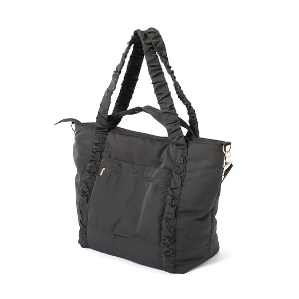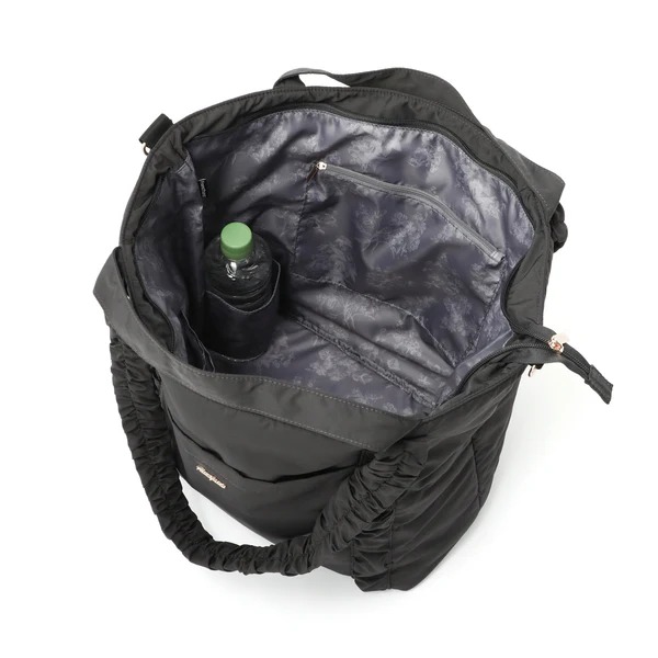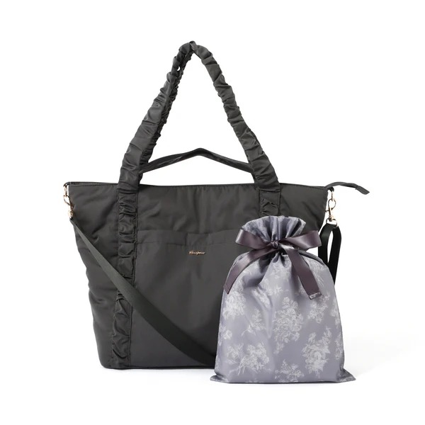 フランフランの「クラシックフラワー トラベルバッグ」は、荷物がたっぷり入るトラベル用トートバッグ。1泊2日程度の短期間の旅行に最適で、スーツケースの取っ手に固定できるため移動時も便利に使用できるのが魅力です。手持ちしやすい短めの持ち手と肩掛けできる長めの持ち手に加え、ななめがけ可能なショルダーストラップの3WAY仕様で、シーンに合わせて持ち方を選べるのが特徴。内側には小物を整理できるポケットが充実しており、ドリンクホルダー付きで水筒も倒さず持ち運べます。トートバッグ本体は、持ち手部分がフリルのようにクシュッとしたデザインで、シンプルながらもかわいさを感じさせる仕上がり。カラーはダークグレーとライトピンクの2種類で、公式サイトでは税込み6900円で販売されています。