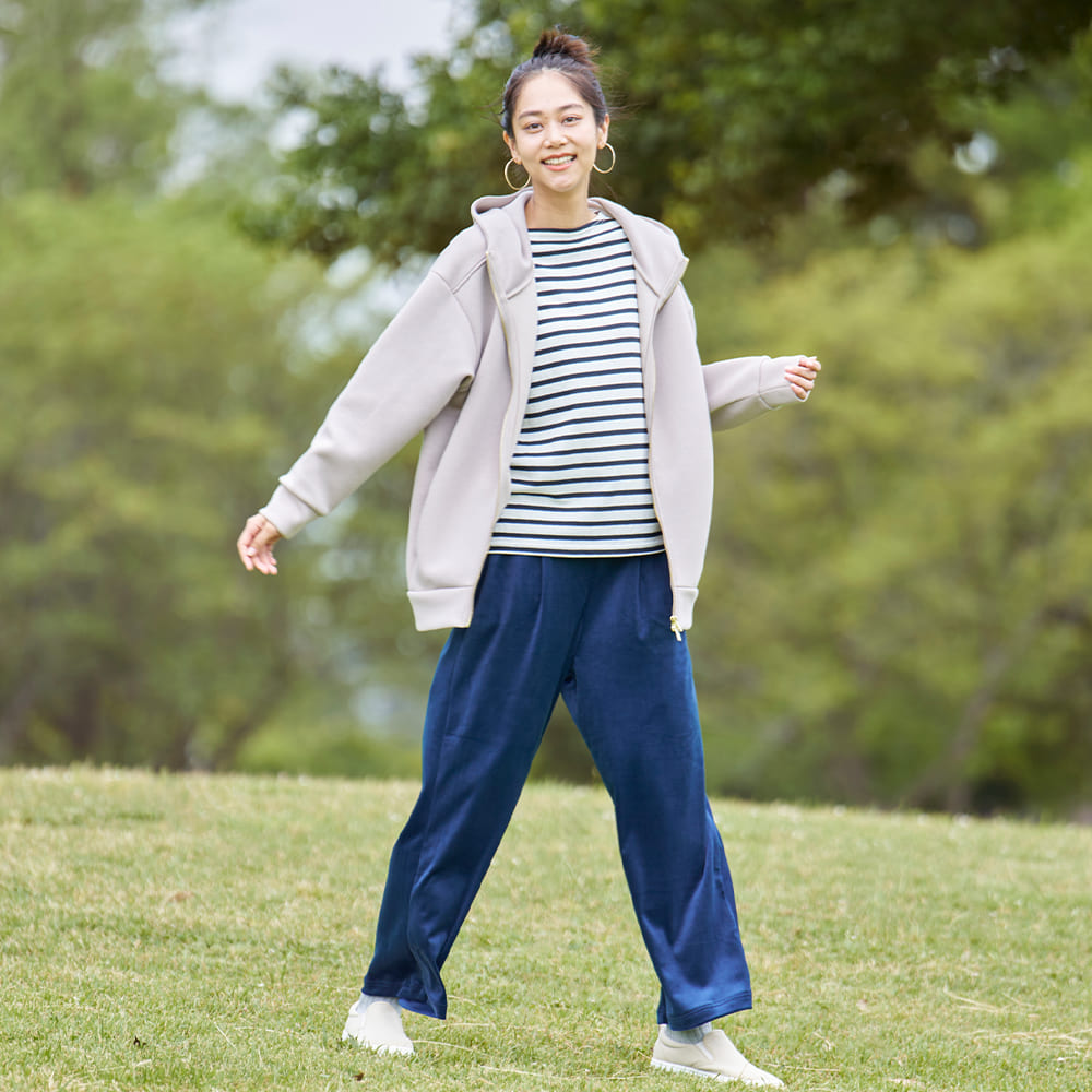 生地にはストレッチ性のある素材を使用しており、動きやすく快適な着心地を実現。フロントには上下どちらからでも開閉できるダブルファスナーを採用しており、下側を少し開けることで腰まわりのもたつきを抑えた着こなしができ、着脱もしやすい仕様です。
