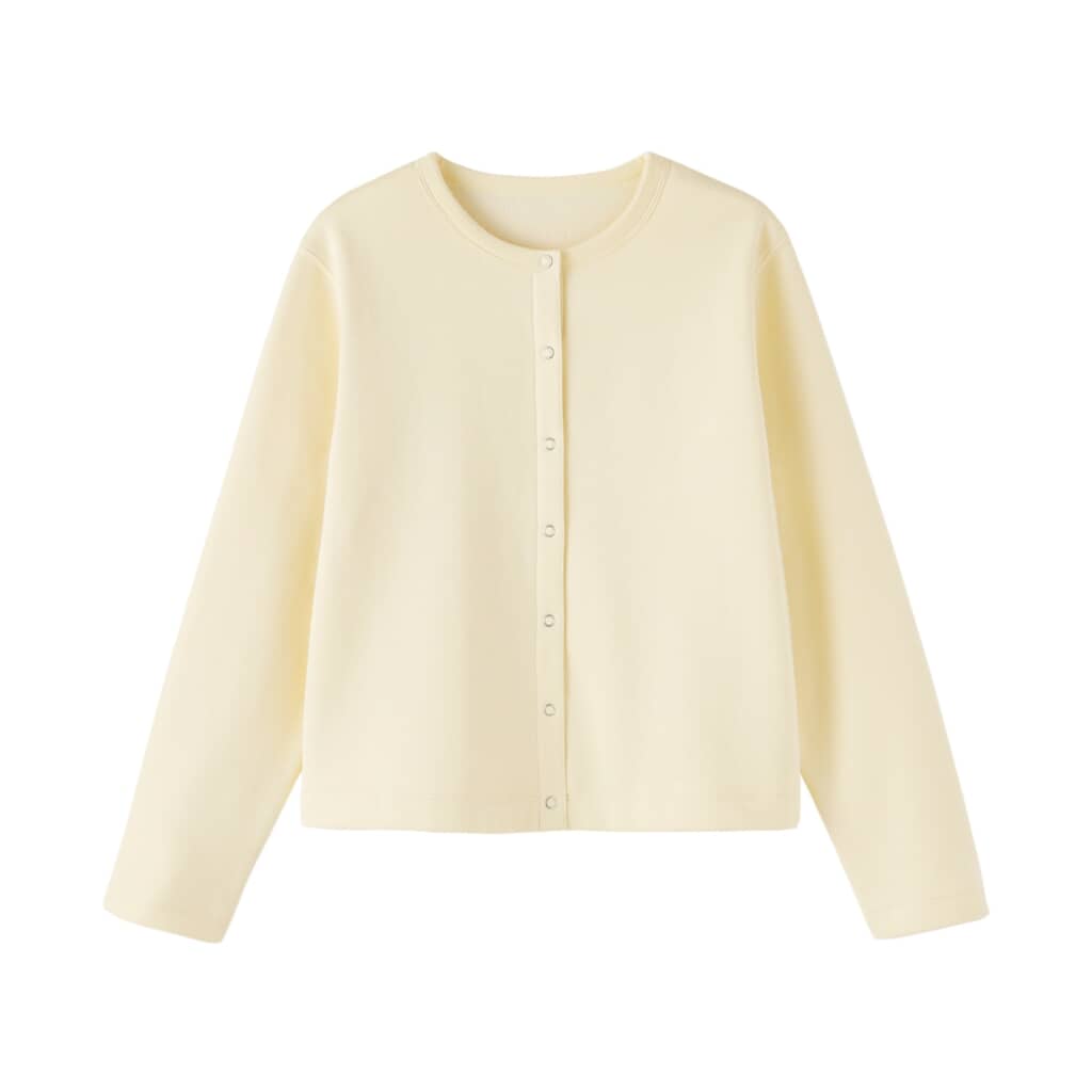 第2位は「婦人 スウェットカーディガン」でした。裏起毛のスウェット素材を使ったカーディガンです。肌触りが良く軽い着心地に仕上げられています。カラーは「オフ白」「黒」「ライトイエロー」「モカブラウン」の4色で、価格は税込み2990円。シンプルで清潔感のあるデザインなので、さまざまなシーンで活躍するでしょう。まだまだ肌寒さの続く春先の羽織りとしてもぴったりです。