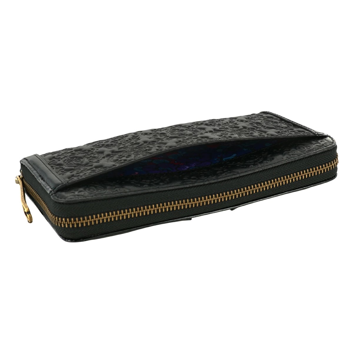 ANNA SUI(アナスイ)の「セルパン ラウンド長財布」は、アンティーク調の見た目が印象的な牛革製の長財布です。表面のブローチには、神聖な動物で金運をもたらすと言われる白蛇があしらわれています。エンボス加工の凹凸によって、素材におしゃれな模様が表現されているのも魅力。額部分には光沢のあるエナメルが使われており、質感が異なる素材のコントラストが楽しめます。ラグジュアリーなデザインのため、持っているだけで気分が上がりそうですね。