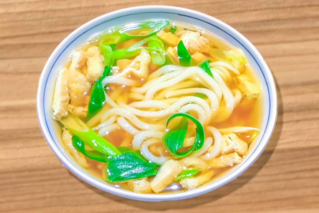 大阪うどんは、だしによくなじむ太すぎないもっちりとした食感が特徴。甘辛く煮た油揚げをのせた「きつねうどん」や、牛の小腸をラードでカラカラに揚げた油かすを使った「かすうどん」など、さまざまなうどんが親しまれています。