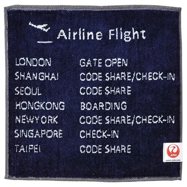「JALオリジナル ミニタオル 電光掲示板」は、JALロゴや機体をモチーフに、フライトシーンをイメージしたデザインのミニタオルです。柄名の通り、空港の電光掲示板を連想させるようなモチーフが取り入れられており、世界の都市名にあわせて、ゲートオープン・チェックインなど、フライト状況が描かれています。