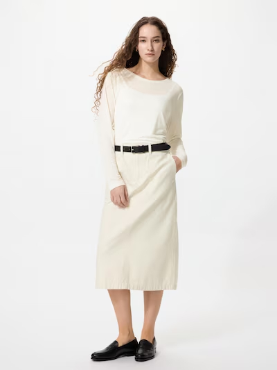 「シアーT」(1990円)は、薄手でやわらかな素材を使用しており、肌にやさしくなじむ軽い着心地が特徴の上品な一枚。デザインはベーシックなTシャツをベースにしつつ、首元は詰まりすぎず抜け感のあるバランスです。キャミソールやブラトップと組み合わせることで、インナーのカラーをほんのり透かしたコーディネートが可能。重ね着しても軽やかなスタイリングに仕上がります。シンプルな無地デザインのため、デニムやスラックス、スカートなど幅広いボトムスと相性が良く、カジュアルからきれいめまで対応可能です。