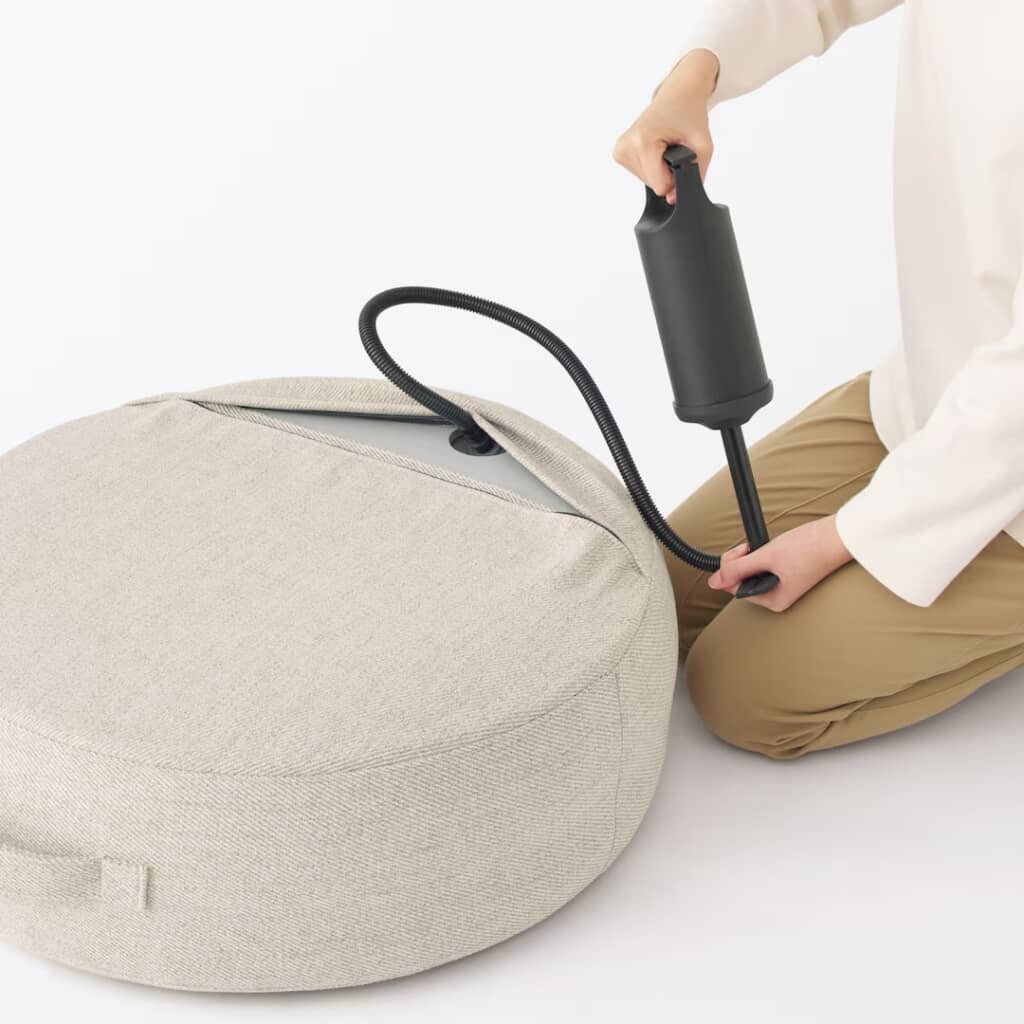 無印良品から販売されている「空気でできたフロアクッション ポリエステル」が、そのまま座るクッションとしてもオットマンとしても使用でき、空気でふくらむので使用しない時は空気を抜いてコンパクトに収納できるので、使い勝手がとてもよいと高評価を集めています。