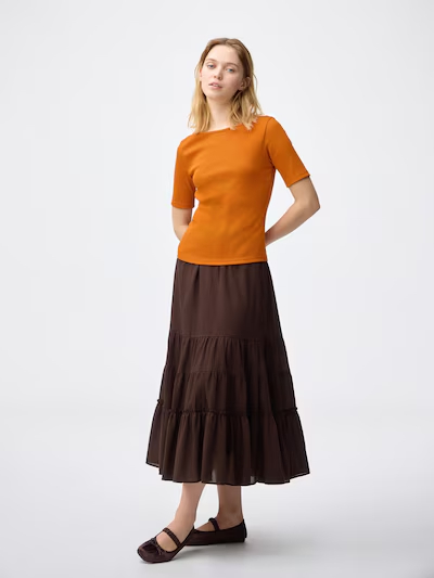 「リブボートネックT」(990円)は、首元を美しく見せるボートネックと、体にほどよくフィットするリブ素材が特徴のトップス。丈は短すぎないショートレングスで、腰まわりがもたつかずすっきりと収まるため、ハイウエストのボトムスともバランスよく合わせられます。1枚で着ても、ジャケットやカーディガンのインナーとしても使いやすい汎用性の高さも魅力です。