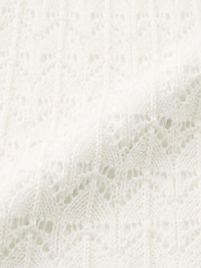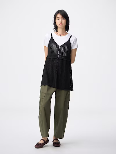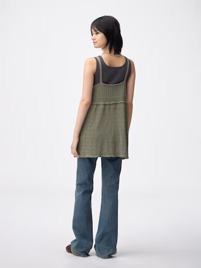 GUの「透かし編みニットキャミソールチュニック」(2490円)は、凹凸感のある透かし編み素材が特徴のアイテム。裾にフリルをあしらったデザインで、チュニック丈のため腰まわりを自然にカバーしながら、シンプルなトップスに重ねるだけでコーディネートに奥行きと抜け感をプラスしてくれます。