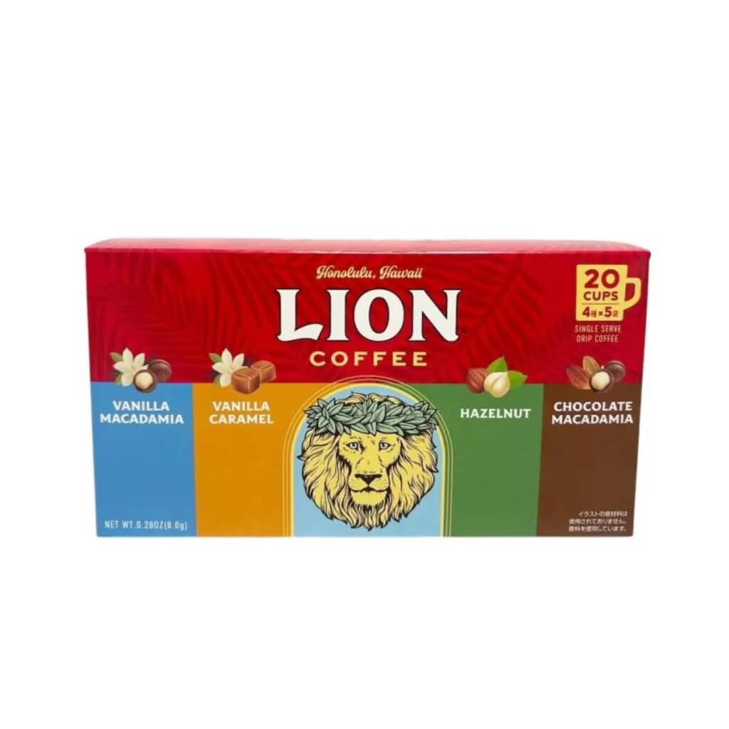 「ライオンコーヒー ドリップバッグ4種アソート 20袋入」は、ハワイで8年連続人気ナンバーワンに選ばれた実績を持ち、米国でも現存する最古のコーヒーブランドの一つとされているライオンコーヒーのドリップコーヒー。100%アラビカ種を使用し非常に浅い焙煎によって苦みを抑え、甘い香りと軽やかな味わいを楽しめるのが特徴です。バニラマカダミアやバニラキャラメル、チョコレートマカダミア、ヘーゼルナッツなど多彩なフレーバーがそろい、ブラックでもミルクと合わせても◎。香り豊かな一杯を気軽に味わえるのも魅力です。