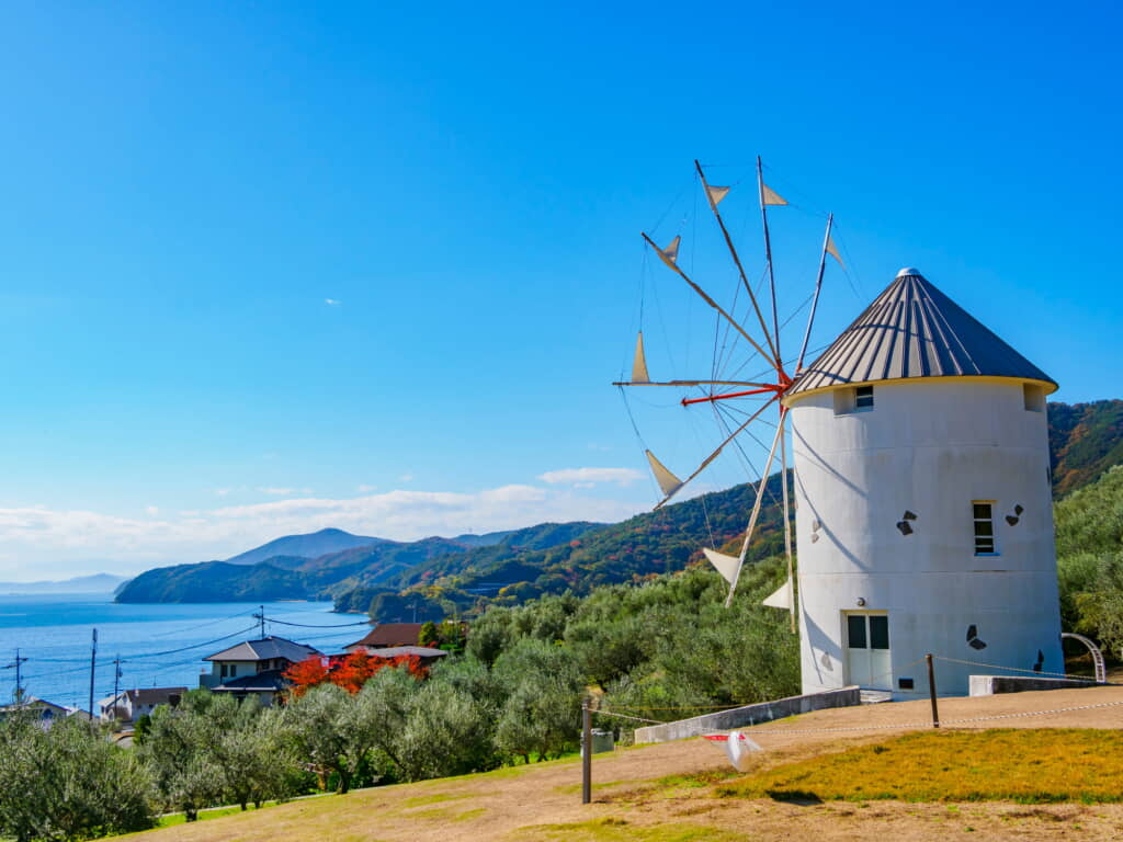 瀬戸内海の絶景とともに、非日常の世界観を楽しめるスポットとして人気を集めているのが、道の駅「小豆島オリーブ公園」です。約2000本のオリーブ畑に囲まれた広大な敷地には、白いギリシャ風車や映画「魔女の宅急便」をモチーフにした施設など、思わず写真を撮りたくなる風景が広がります。地中海のような雰囲気と穏やかな空気が共存し、観光はもちろん、ゆったりとした時間を過ごしたい人にも支持されているスポットです。