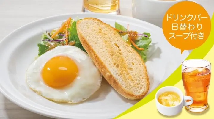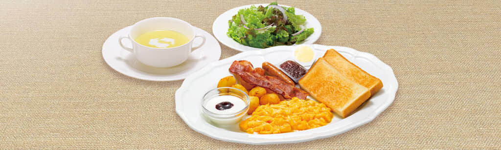 ロイヤルホストでは「ブレックファストメニュー」としてモーニングを展開しており、トーストにサラダ、スクランブルエッグやコーンのポタージュなどがセットになった「ロイヤルホストモーニング ~コーンのポタージュ・サラダ付~」をはじめ、「フライドエッグプレート(モーニング英国風パン)」や「スクランブルエッグプレート(トースト)」といった幅広いメニューをラインアップしています。