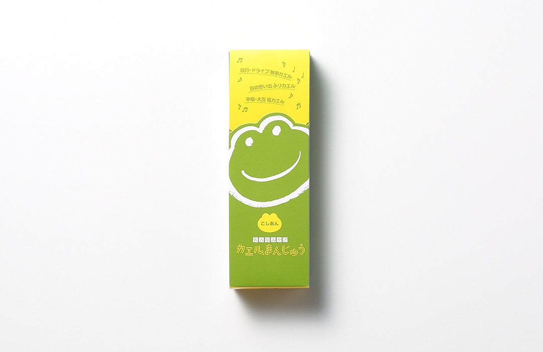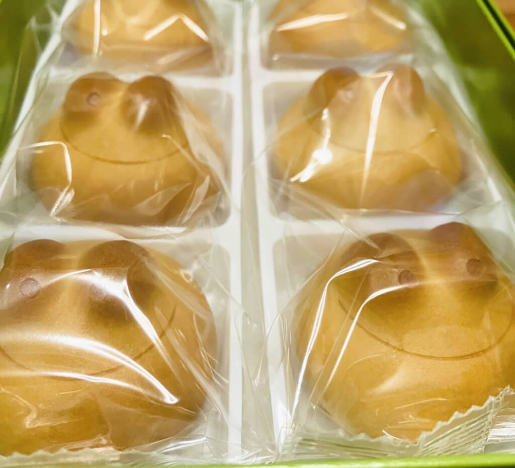 実際に「カエルまんじゅう」6個入りを購入してみました。箱のふたを開けると、にっこり笑ったカエルたちがずらり! ひとつでもかわいいですが、たくさんいればいるほどインパクト大です。
