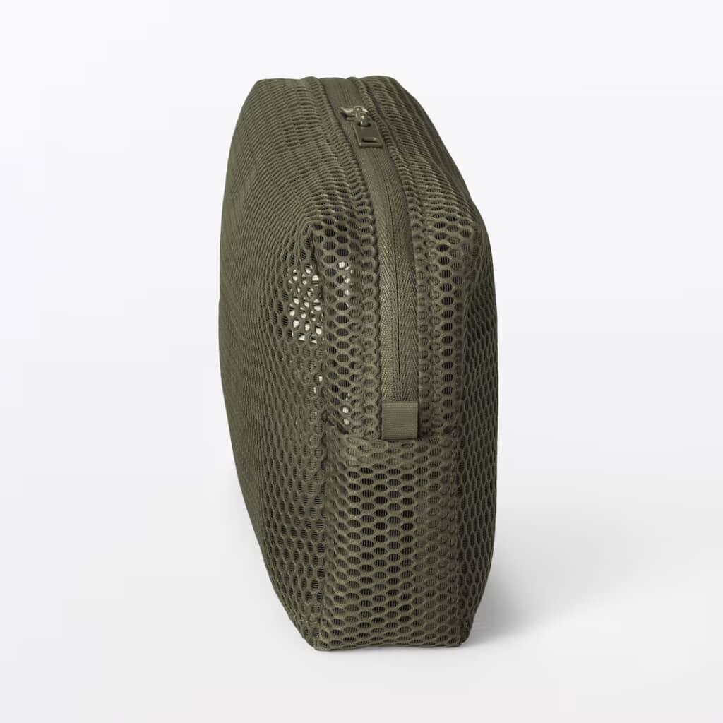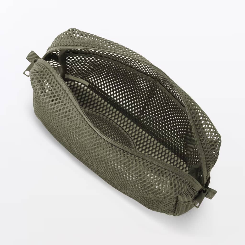 無印良品の「立体メッシュ 小物整理ポーチ」は、小物をすっきり持ち運ぶのに便利なメッシュポーチです。内側には仕切りが付いており、細かなアイテムも整理しやすく、必要なものをすぐに取り出せます。上部はファスナー仕様で大きく開くため、中身が見やすく出し入れもスムーズ。約幅190×高さ125×マチ60ミリとコンパクトなサイズながら収納力があり、日常使いやオフィスでの使用にも適した実用的なアイテムです。カラーは黒・カーキ・ピンクの3種類、価格は税込み1290円で販売されています。