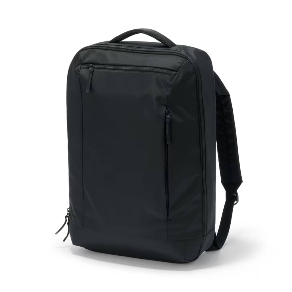 本体には撥水加工が施されており、急な雨でも中身が濡れにくい仕様。内部にはノートパソコンを収納できる専用ポケット(※300×270×40ミリメートル以内)を備え、キャリーバーに通せるベルトも追加。見た目はすっきりとした薄型で、電車の中でも邪魔になりにくいのもうれしいポイントです。