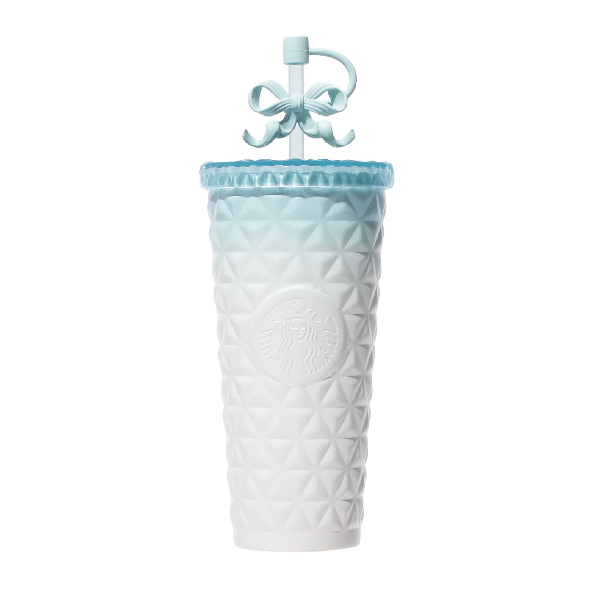 スターバックスの「ステンレスコールドカップタンブラーナチュラルブルーグラデーション591ml」は、本体もリッドもクリスタルのような凹凸のある形状が目を引く、冷たいドリンク専用のステンレスコールドカップタンブラーです。韓国のスターバックスで販売された商品にインスピレーションを得た商品で、ホワイトからブルーへ移ろうグラデーションに、リボン型のストローチャームがアクセントになっています。