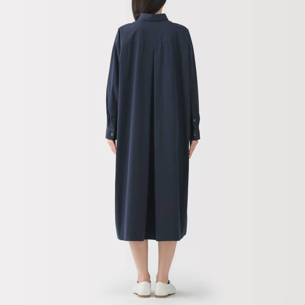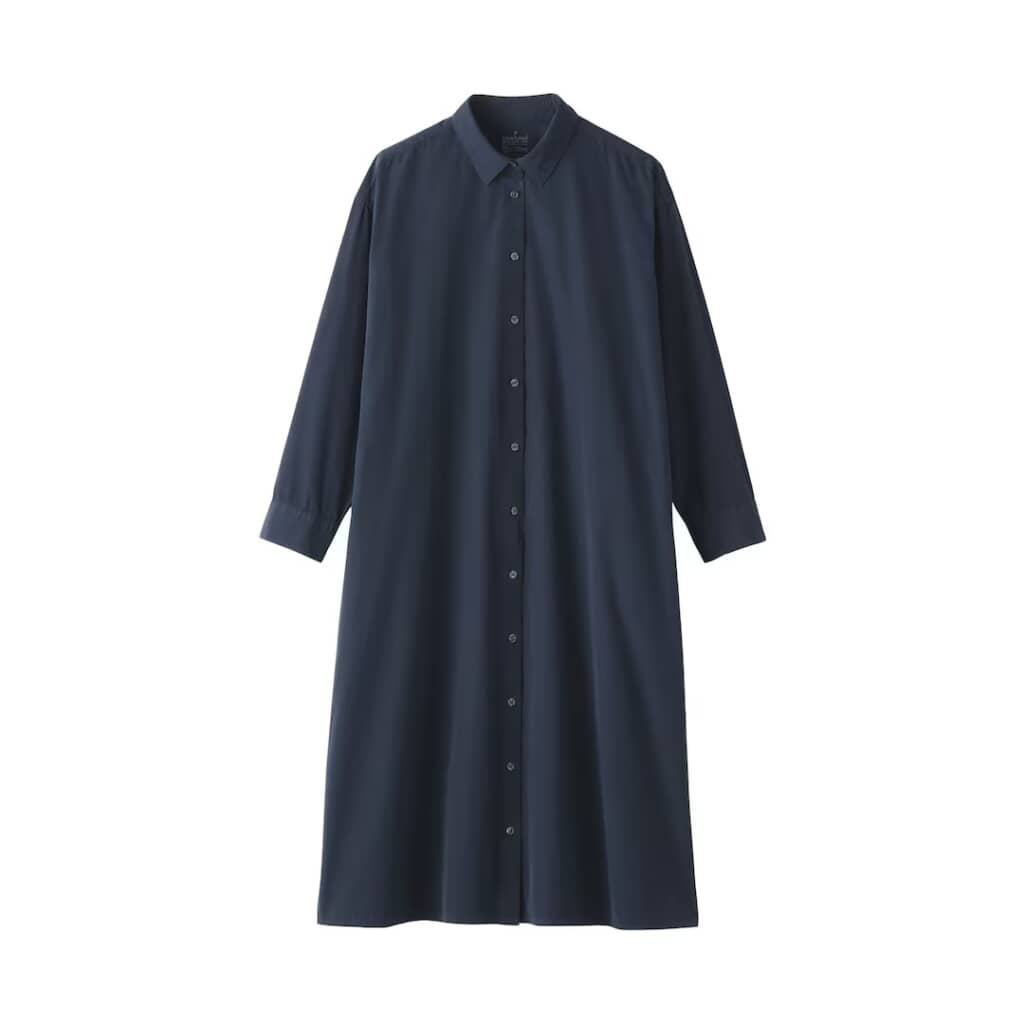 無印良品の「婦人 洗いざらし ブロード長袖シャツワンピース」は、微起毛加工を施した生地を使用し、やわらかくしっとりとした肌触りに仕上げた長袖シャツワンピース。素材にはオーガニックコットンを採用し、自然な風合いと着心地の良さを実現しています。デザインはレギュラーカラーのベーシックなスタイルで、身幅にゆとりを持たせつつ裾にほどよい広がりを持たせているのが魅力。透けにくいので、一枚での着用はもちろん、羽織としても活躍する汎用性の高い一着です。カラーはダークネイビー・白ストライプ・サックスブルーストライプの3種類、価格は税込み4990円で販売されています。