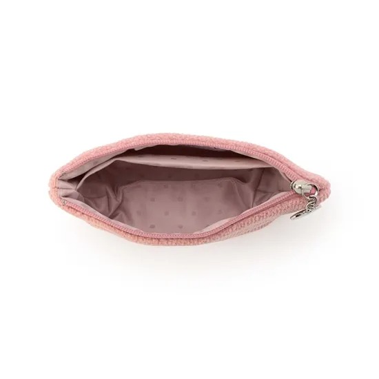 また、マチ付きの舟型フォルムによりコンパクトながら収納力を確保しており、コスメや小物をすっきりと整理しやすい設計です。サイズはタテ約8cm、ヨコ約14.5cm、マチ約4cmと、バッグの中でもかさばりにくい絶妙なサイズ感で、日常使いに適しています。