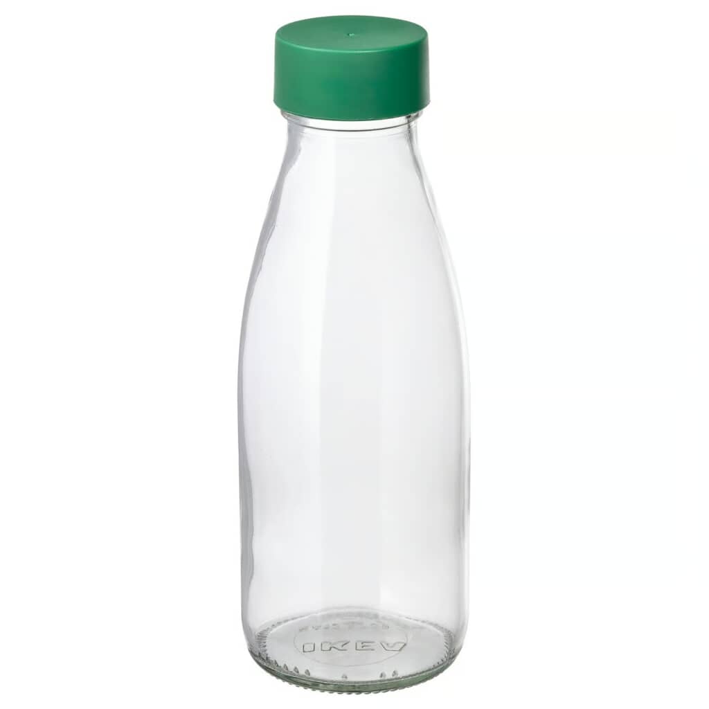 IKEAから販売されている「SPARTANSK スパルタンスク 水筒, クリアガラス/グリーン」が、ガラス製でお手入れがしやすく、500ミリリットルサイズなのにコンパクトなので、持ち歩く際も冷蔵庫に入れておく際にも場所を取らないと高評価を集めています。