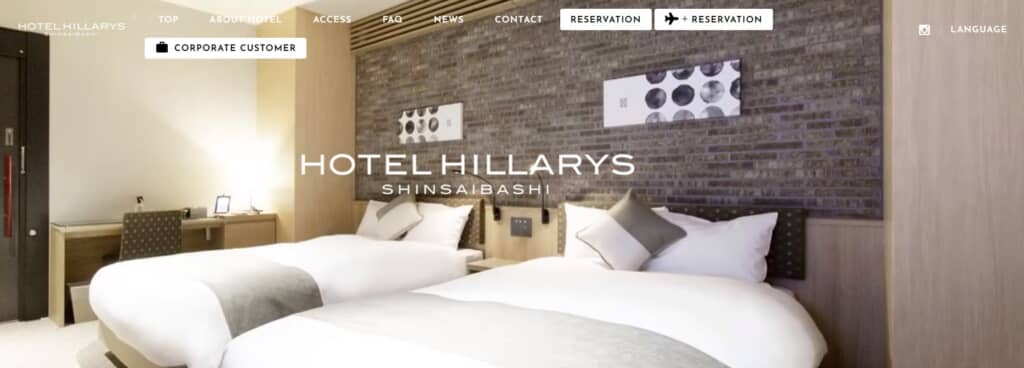 「ホテルヒラリーズ心斎橋」は、地下鉄御堂筋線「心斎橋駅」6番出口より徒歩約3分の場所に立地しているホテルです。伝統的な日本建築のしつらえと、 さまざまなアートを融合させた空間デザインが特徴で、ビジネスマンの利用におすすめの「ダブルルーム」や、家族や友人とも利用できる「ツインルーム」などの客室を用意しています。