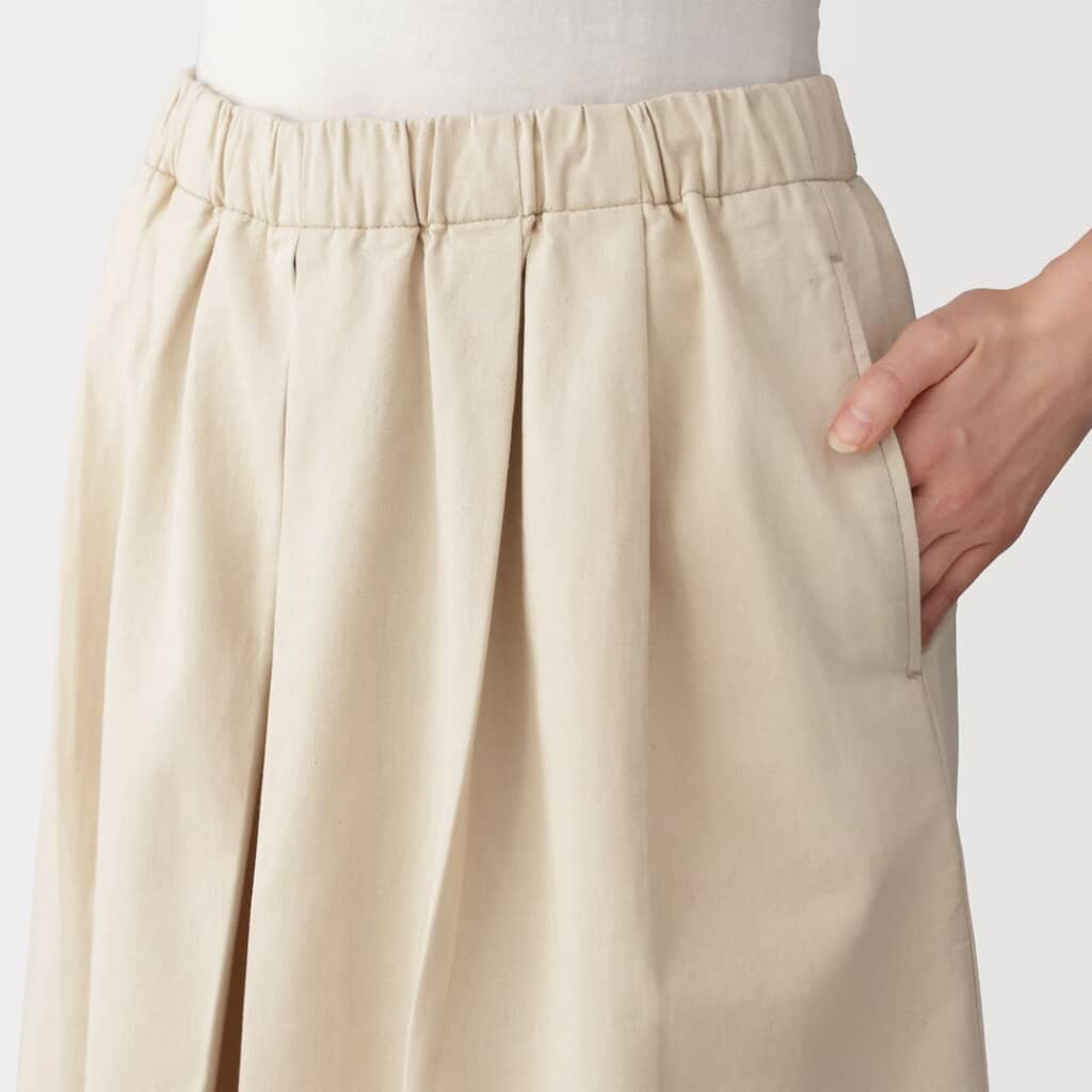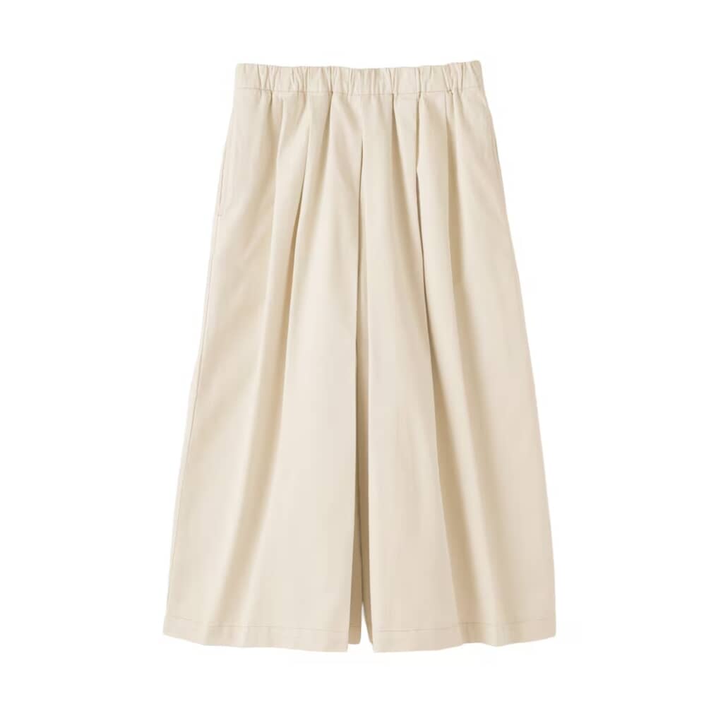 本記事では、2026年3月30日時点でオンラインストアでは各カラー・サイズ共にほぼ在庫切れとなるほど人気を集めている「婦人 カポック混 ライトツイルスカートパンツ」について紹介します。