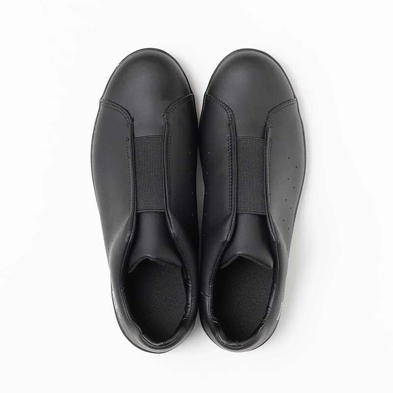 アッパーに合成皮革が使われており、汚れを拭き取りやすいのも魅力。靴ひもを締めるタイプではなく、左右の生地がシュータンの上のゴム素材で連結されたデザインです。ひもを締める時間がかからず、スムーズに脱ぎ履きできます。外を歩いている時にひもがほどけることもないため、結び直す手間もなくストレスフリーで使用できるでしょう。