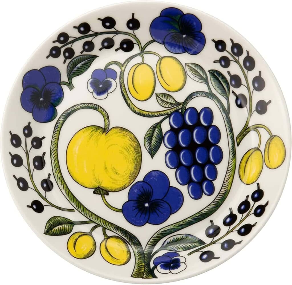 そんなARABIA(アラビア)の「パラティッシ プレート 21センチ カラー」は、フルーツ・花を大胆に描いたクラシックコレクション「パラティッシ」のアイテム。「パラティッシ」は、フィンランド語で「楽園」を意味します。ブルーとイエローのカラータイプは、1969年の登場から愛され続けている初期デザイン。1972年にシックなブラック・2012年にパープルが加わりました。直径21センチ・高さ3センチで食パン・ケーキなどを盛りつけるのにちょうどいい大きさ。オーブン・電子レンジ・食洗器対応で、気兼ねなく使えるのもうれしいポイントです。公式サイトでは、税込5500円で販売されています。