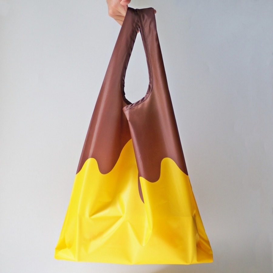 神奈川県内を中心に展開するプリン専門店、マーロウは、ビーカー入りの手作り焼きプリンで知られるブランドです。「プリン型エコバッグ」は、そのプリンをイメージしたフォルムが印象的なアイテム。カラメルが滴るようなデザインで、収納袋にはロゴやビーカーの目盛りをあしらうなど、ブランドの世界観を感じられるつくりになっています。