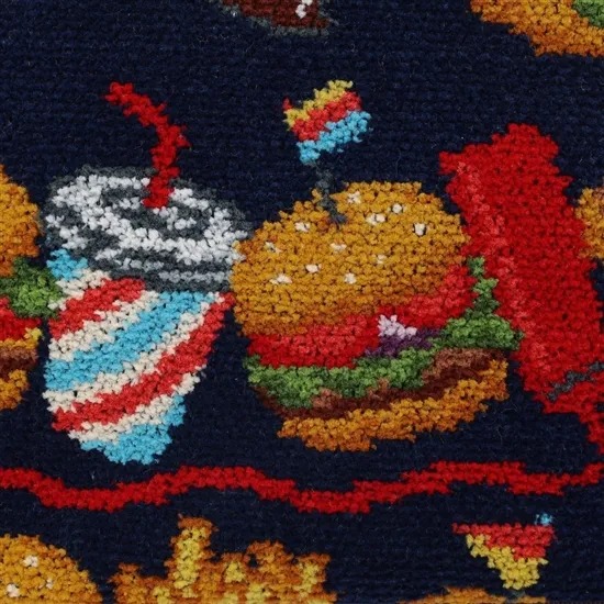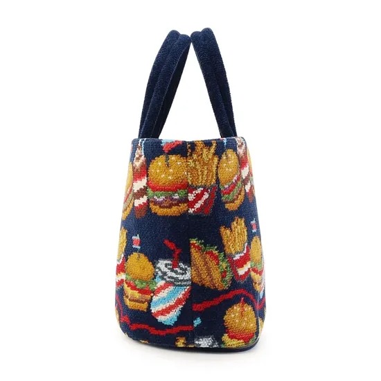 「バーガーショップ 巾着付きバッグ L/BUR-257131」は、フェイラーの「LOVERARY BY FEILER」から展開されているバッグです。柄にはハンバーガーを中心に、サンドウィッチやドリンク、フライドポテトが描かれており、見ているだけでも楽しい雰囲気に仕上げられています。価格は税込1万5400円で、展開カラーとしてネイビーとグリーンが確認できます。
