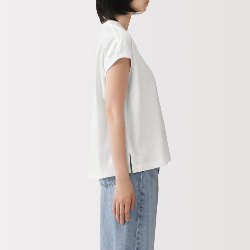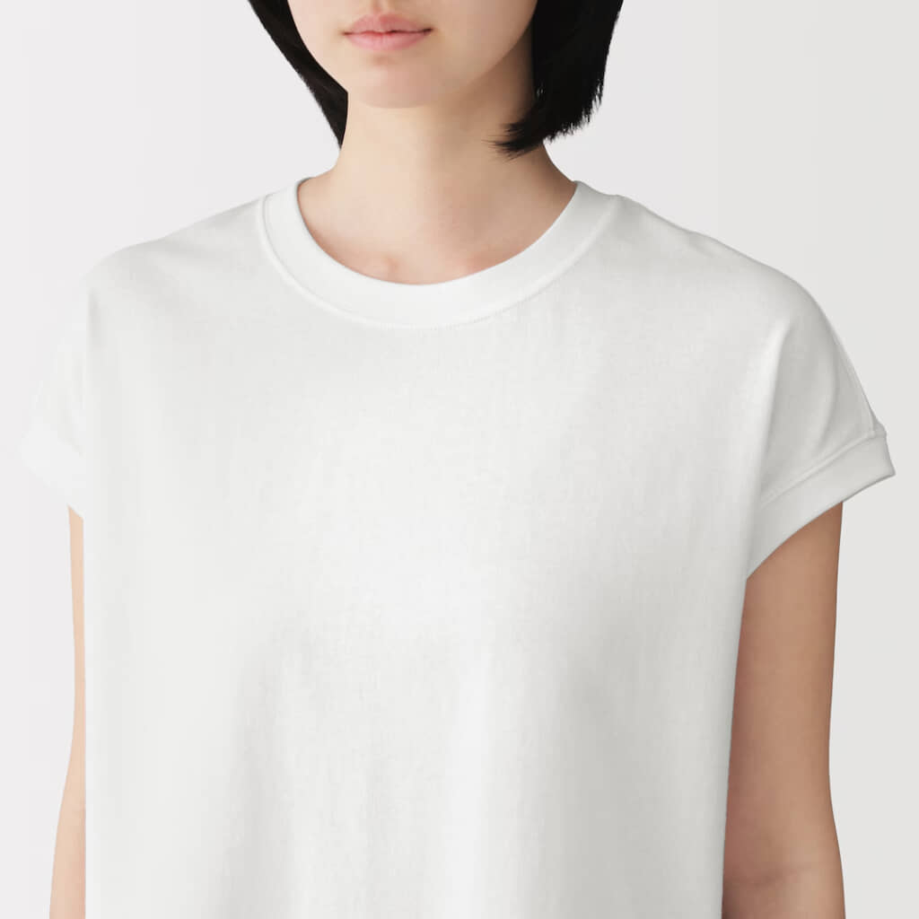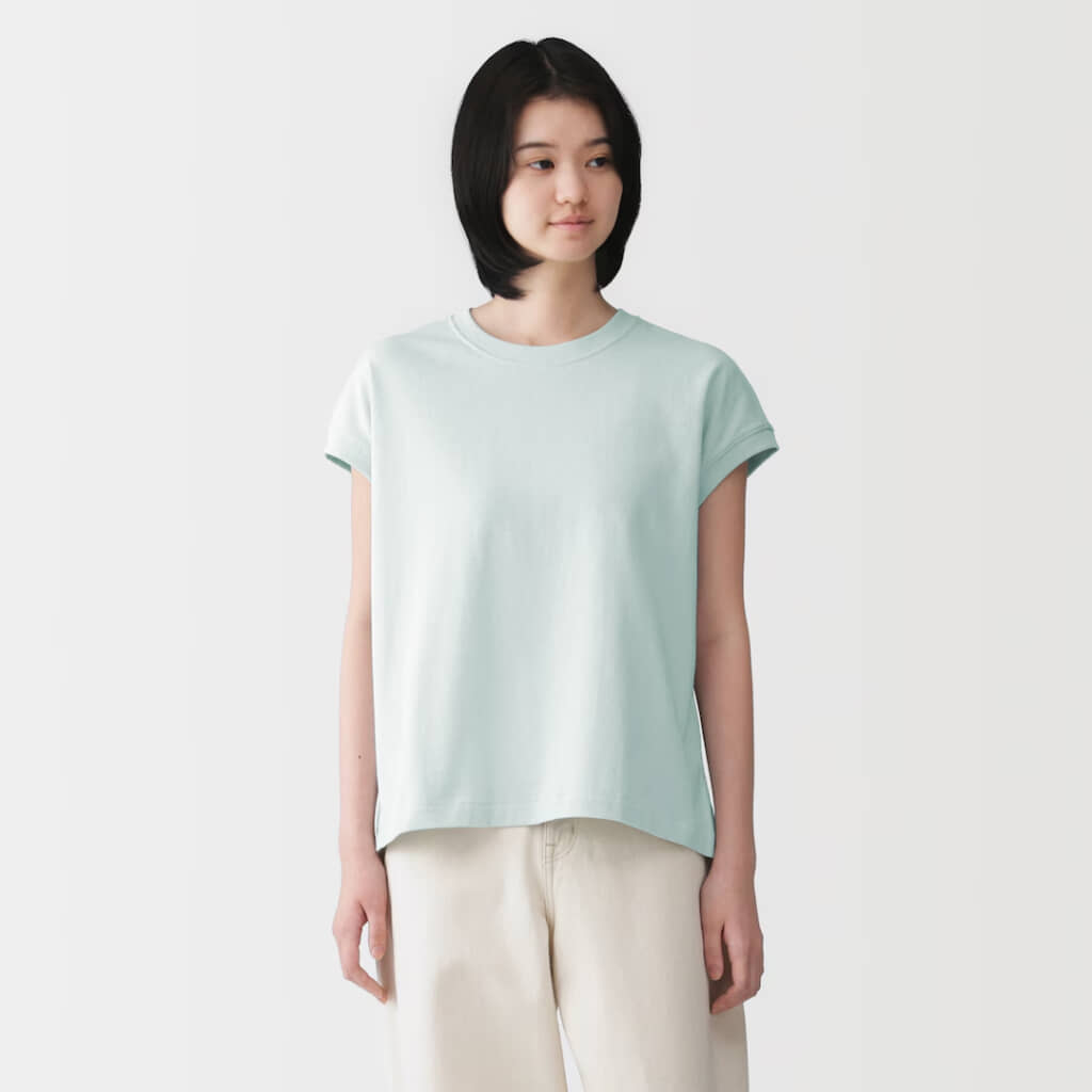 無印良品の「婦人 引き揃え天竺編みフレンチスリーブTシャツ」(1490円)は、シンプルな見た目の中に素材と着心地へのこだわりが詰まった、日常使いに最適なカットソーです。素材は「引き揃え天竺編み」のもの。2本の糸を引き揃えて編み立てることで、ほどよい厚みとハリのある素材を実現。透けにくく、身体のラインを拾いにくいため、ラフに着てもきちんとした印象を保てるのが魅力です。カラーは白やライトブルーなどのベーシックカラーを中心に展開されています。