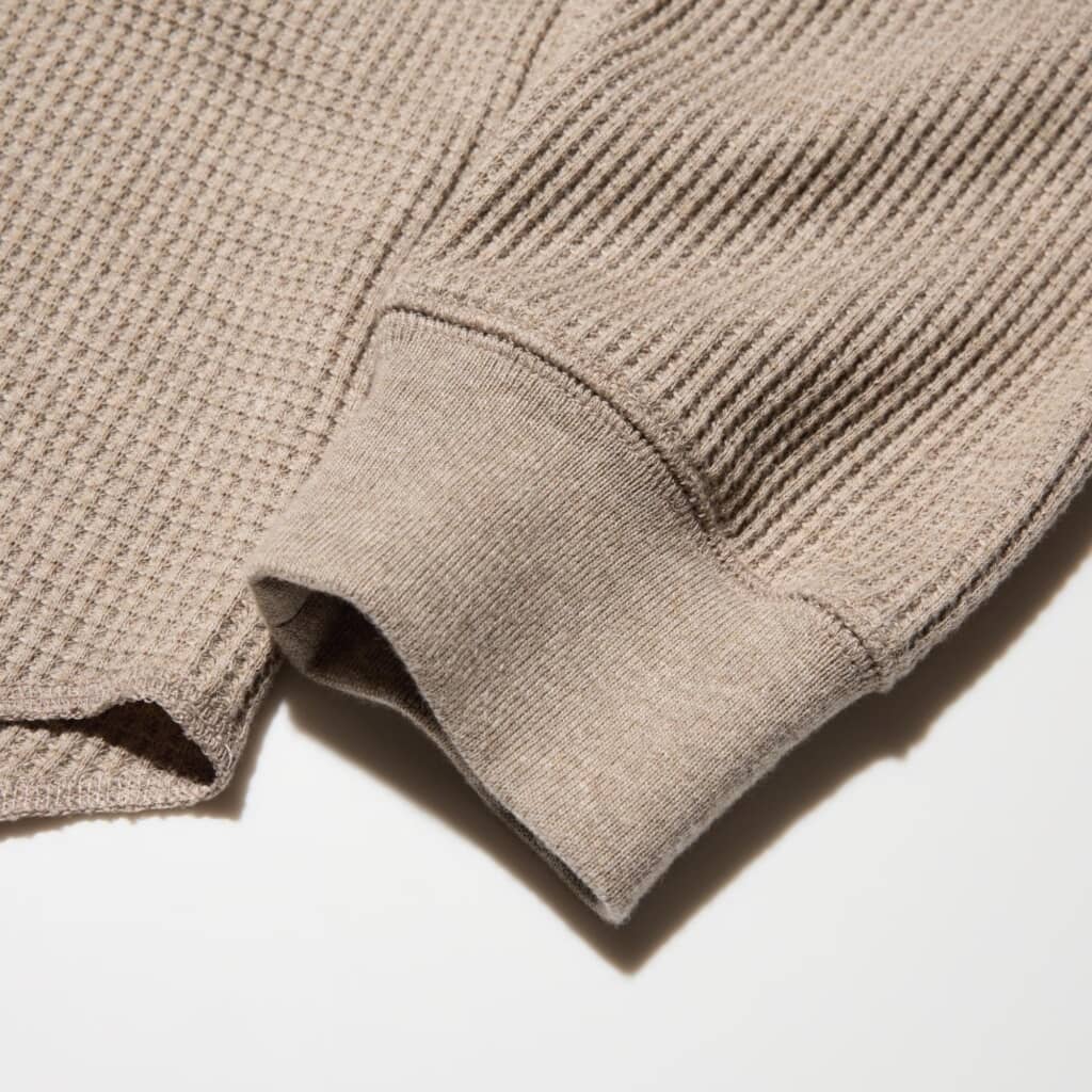 朝晩はまだひんやりするものの、日中は軽やかな服装で過ごしたくなる季節。重ね着を減らしつつ、1枚で着てもサマになるトップスがあると重宝します。そんな時期に取り入れやすいのが、表情のある素材感でほどよいカジュアルさを演出できるユニクロの「ワッフルヘンリーネックTシャツ/長袖」です。